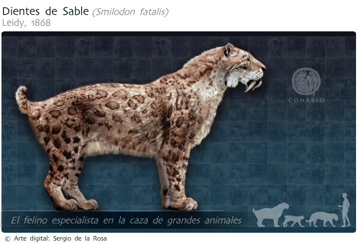 El "felino Dientes de Sable, comúnmente nombrado "Tigre Dientes de Sable", fue un pariente lejano de los felinos que a principios del siglo XXI sabemos viven en el planeta tierra, al parecer, el gato doméstico es un primo más cercano al tigre, que éste último al Dientes de Sable. Se trata de uno de los últimos felinos cuya estirpe (los Machairodontinae) se extinguió al final de la pasada Edad de Hielo hace unos 10 milenios.